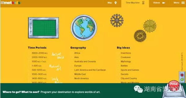 2、乘坐时间机器:定制化的搜索工具让用户可以从大都会跨越5000年的艺术藏品中选择感兴趣的领域。用户可以根据时间年代、地理位置以及热门关注类别进行搜索,热门关注是在Metkids官网顾问专家的观众研究及反馈的基础上总结出的兴趣话题。