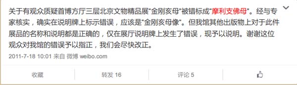 某网友对首都博物馆展览展品标签的批评以及首都博物馆的回应
