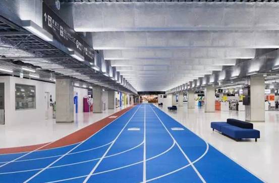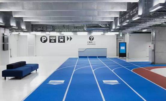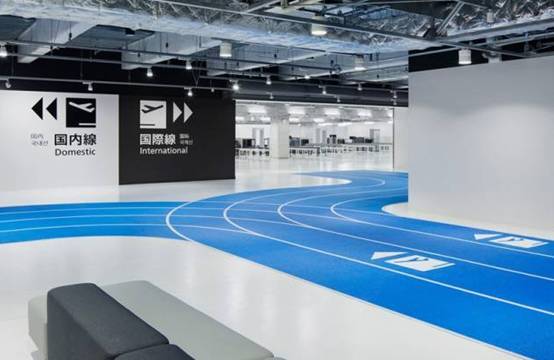 因为无印良品负责航站楼的软装设计,整个航站楼内部都走极简风格。视觉上略显空旷,乘机流线不再是复杂的标识指示,而是直接被画在地上,于是一条条像体育馆里的塑胶跑道出现在了机场里,并像高速公路一样为乘客指示着方向与距离,极具创意,实用且高效。