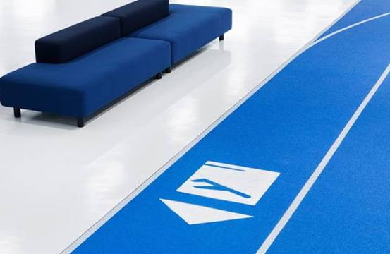 家具和装饰的缤纷色彩让整个候机大厅不至于太冷清,蓝色引导出发,红色引导到达,根据人流量估算,无印良品还在地面设置了颜色指路标志如下图。