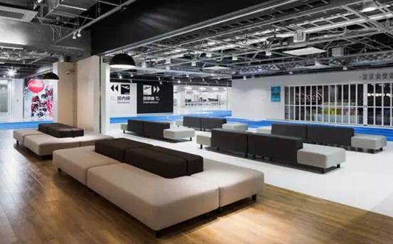 蓝、绿两种颜色在交通行业中代表着快速与便捷,四百多个沙发套整齐排列,蓝绿两种色彩在白色灯光和地板的映衬下光彩夺目。