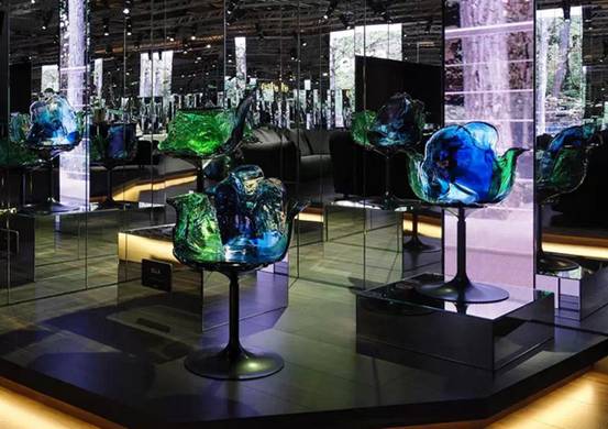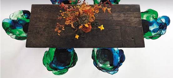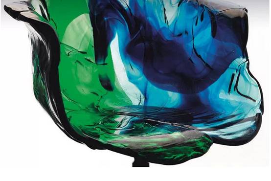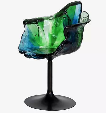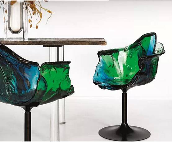 艾拉采用了聚碳酸酯为材质,完全是通过手工雕刻制作而成的。它的外形像国画里的一片荷叶,黑色的腿部像植物的茎部,椅身浓墨重彩。独特的制作方法,使它的色彩分布并不规律,每一个部分都是独特的,透明的绿色、蓝色和透明色相互融合,给人一种染料扩散在水里的感觉。
