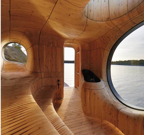 由Partisans工作室设计的岩洞桑拿房被建在一个湖畔,位于多伦多北部的 Sans Souci 岛上,依着自然的花岗岩形状而建,内部结构是木质镶嵌。真不知一边蒸桑拿一边赏美景是怎样的心情。