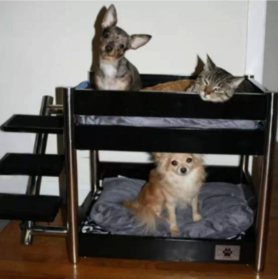 如果你是阿猫阿狗控,又偏偏住着小房子,那这款宠物双层床可算是拯救了横七竖八躺在地板上的阿猫阿狗们了。这款宠物床分为上下两层,一侧有三个台阶组成的梯子,框架采用不锈钢做成,垫子表面为超细纤维,可机洗,垫子有多种颜色可选。不知道宠物们从小平房搬进公寓楼是什么样的一种感受。