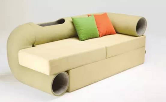 这款管道沙发的最大亮点就是把沙发的靠背和扶手改造成了“管道”,猫猫可以轻松自如地在里面爬来爬去,玩累了也可以睡在里面。设计者在沙发的靠背处也增加了一个宽出口,主人坐在上面休息的时候,猫猫可以随时在出口处露出小脑袋,瞬间能把人萌化。