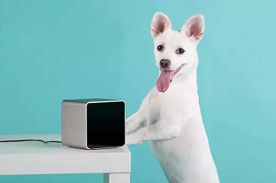 这个产品名叫Petcube内置138度覆盖的广角摄影机,能够提供 720p的高清录像。隐藏的其它装置还包括麦克风、扬声器和一个激光指示器。铲屎官们可以通过手机App连接无线网络调戏、监控萌宠们在家的一举一动,随时可以调戏一番。