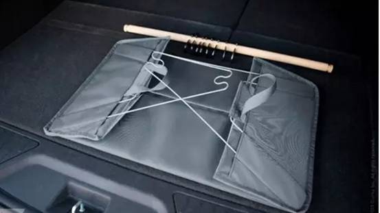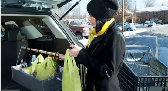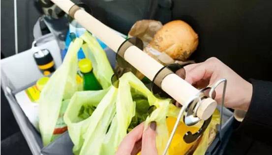 车主们常会在下班回家的路上顺道买菜,车上大多没有可专门挂靠塑料袋的地方,只能平放,但这样在车辆左摇右转中,袋中物品就很容易撒出来,尤其油腻的肉类、或解冻后的汁水倒出来弄脏爱车就更让人不愉快。设计师在我们常见的无纺布收纳盒的基础上增加了两条金属支架和一根木棍,这样收纳盒仍然可以用来收纳杂物,而装有食材的塑料袋就可以悬挂在木棍上,再不会担心会洒出来。