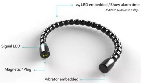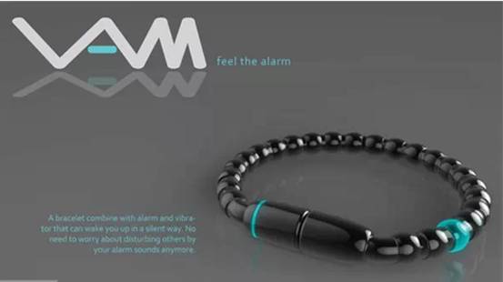 早晨起床是件艰难的事,如果没有闹钟,恐怕会沉睡到不知何时,但是闹铃声往往也会把身边那位还不准备起床的伴侣一并吵醒。设计师Yi-Hong Chou带来的这款VAM手链闹钟,就让我们不会再产生这样的烦恼。VAM由代表着24小时的24个Led灯组成,通过内置的蓝牙功能,你可以很容易的通过智能手机上的应用程序来设置唤醒时间,一旦设置成功,手链上相应的LED就会点亮,从而表明你的闹钟时间。而闹钟方式自然就是无声的振动,完全不会打扰到其他人。