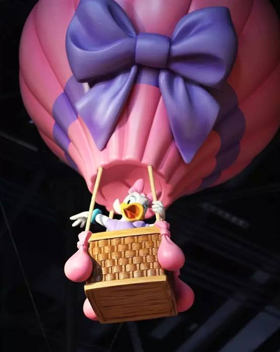 抬头看,米奇、米妮、高飞、唐老鸭、黛丝、布鲁托,以及钢牙奇奇和大鼻蒂蒂正在热气球上向你打招呼,还有动态的“云彩”漂浮其间。
