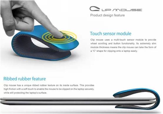看起来平板电脑会比笔记本电脑拥有更美好的未来,但它还有很长的路要走,而眼下,笔记本电脑仍是许多会议或办公中不可或缺的选择。因此,设计师在思考如何让笔记本电脑配备一个更完美的鼠标,他最终的解决方案是鼠标夹(Clip Mouse)。其独特的C形和灵活的材料,让它可以轻松稳定的夹在笔记本电脑上,让随身携带和使用变得更为自在灵便。