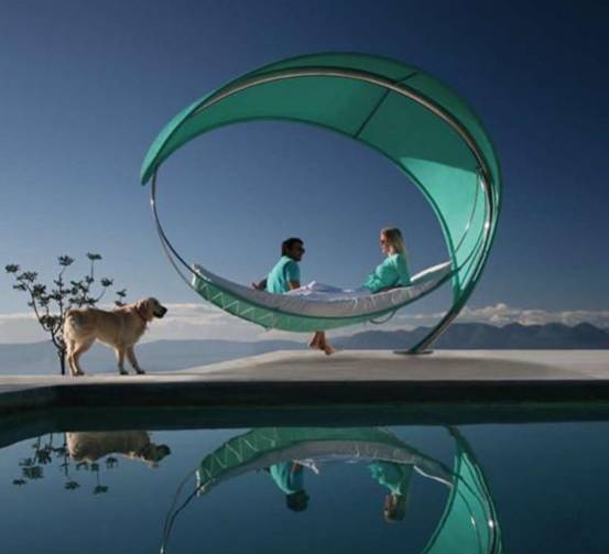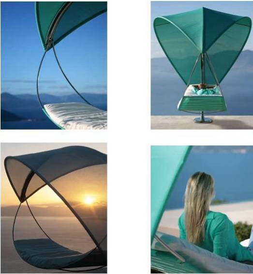 瑞典设计师Erik Nyberg和Gustav Strom为比利时户外家具制造商Royal Botania设计了这款优雅的摇摆吊床,这个构思传达出一种躺在树叶下悠闲自在的感觉,也许它会让你感到进入了小人国,一片小小的树叶就可以遮荫纳凉,它看上去像高雅的雕塑更是一款奢华的户外家具。大流线型的电镀不锈钢支架,遮阳棚为半透明织物覆盖,同时可以提供额外的保护,抵挡86%的太阳射线。如果你拥有一片海滩,那这个吊床你一定必不可少,躺在上面吹吹海风、看看海景,真是人生的享受啊!