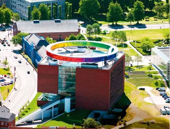 2 006年,丹麦奥尔胡斯市(Aarhus)AROS美术馆发起一项竞赛,向欧美艺术家征求博物馆顶层的改造方案。2007年,冰岛籍艺术家奥拉维尔·埃利亚松(Olafur Eliasson)的《你的彩虹全景》(Yourainbow panorama)获得评委团一致同意。博物馆很快便启动一系列工程,加固现有建筑体,以便能够在审美与功能上实现这件总重250吨的“作品”。