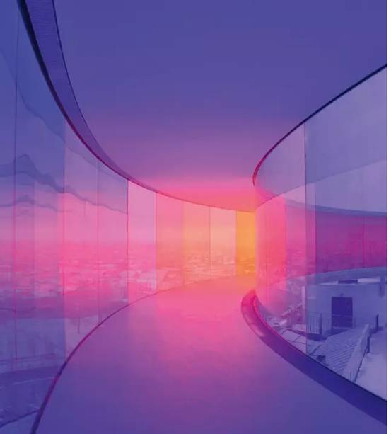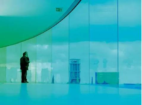 在艺术家的构思中,这条全景走廊也是一座根据日光与色彩变化的城市年轮。每天,阳光穿过彩色玻璃投射到城市建筑上,不同地区轮流被不同色彩覆盖,这使得AROS博物馆既像一座灯塔,又能够暗示城市景点的分部与时间的过渡。在环形走廊内部,观者的体验绝不可能发生重复:时间、日光角度、位置、个人情绪,都会对观者的感知产生影响。而最巧妙的是,奥拉维尔对三原色的使用,取消了艺术家对色彩的人为干预,任何观众都是在同等条件下挖掘个体与环境的特殊契合点。因此,观者的视觉感知成为这条走廊的关键组成部分。换言之,奥拉维尔把观众纳入到了一个共同创作的过程中。