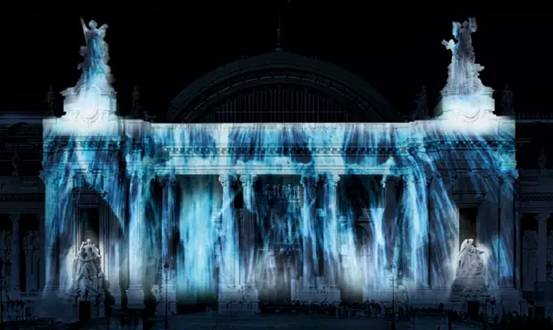 在2015年巴黎艺术博览会(art paris art fair 2015)上,数字艺术团队Teamlab把历史上著名的巴黎大皇宫变成了一个巨大的动态瀑布。该作品是在虚拟的电脑环境中完成的投影模拟作品。所有效果都是由跟踪水流运动的 3D 模型完成,通过电脑计算粒子之间的相互作用,以成百上千连续的水滴形式表现出来。这个概念来源于传统的日本海洋、河流以及水体的绘画,它们都是以弯曲的线条表现出来。