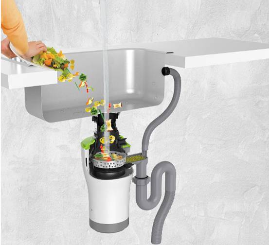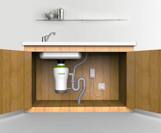 这个垃圾粉碎机可以安装在水槽下方,连接水槽和下水管,拥有 1350 毫升的大容量。剩余的厨房垃圾,无论大小,都可以一股脑的扔进水槽里,粉碎机就可以把这些垃圾研碎成小块,通入下水管。