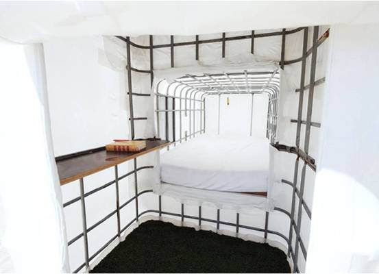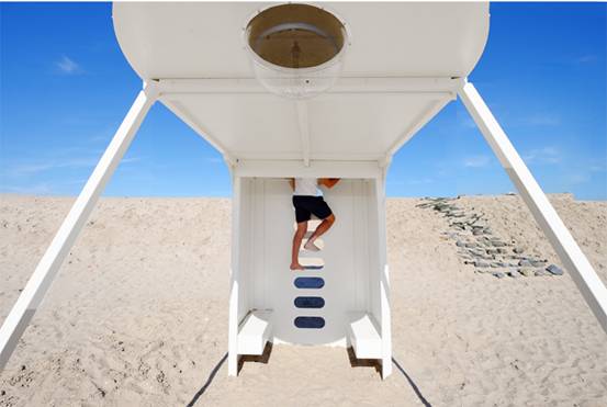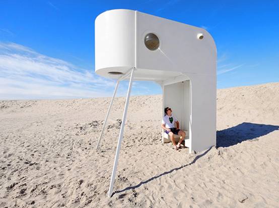 这个营地就像降落在沙地上的生存胶囊。房间里面和外面都可利用,房间里供人休息睡觉,上下左右安装了半球型窗户,确保你的视线无死角;房间外设计了一块区域供休闲,喝点饮料享受生活,下雨下雪都不怕。