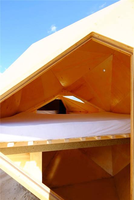 这个房子利用多面体设计,中间有个连廊,能容纳4人睡觉。