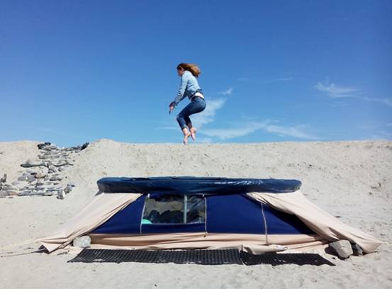 这很像游牧民族的帐篷,但它的屋顶是个蹦床,在里面还可以看到屋顶上玩耍的人。