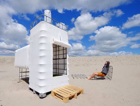 这个房子的材质实际上是收缩包装,类似于塑料薄膜,设计者想把可回收理念运用到房子的设计中。