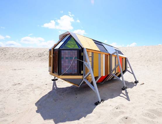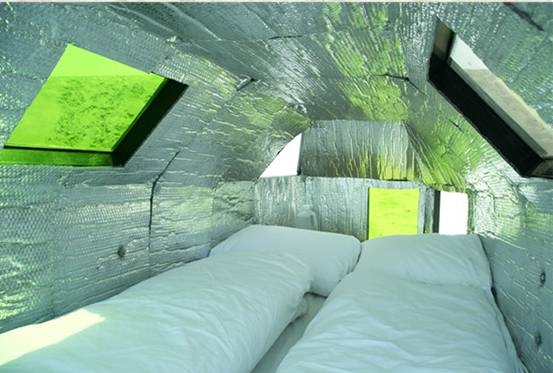 它的名字叫做臭虫,设计师特别欣赏游牧民族房子的设计,认为那些房子既可以和周围环境协调,又能有自己的辨识。于是就有了名叫臭虫的野营房,将大自然的元素结合进去。屋子里面采用了锡纸。