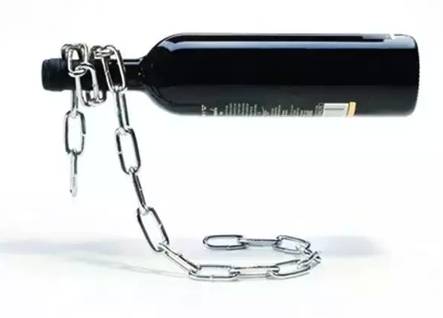 酒瓶悬浮魔术解密:其实是铬铁制成的链条酒架,利用平衡原理制造出视觉上的不平衡感。
