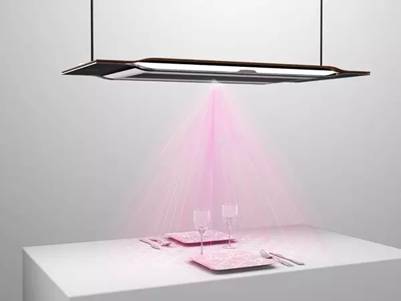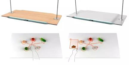 它不仅是一盏灯,也能通过投影自动识别下方的物体。倘若是蔬菜,它就会根据蔬菜品种,投影出菜谱;倘若是餐具、茶具,它就根据物体的形状投射相应的光芒,营造出特别的氛围。