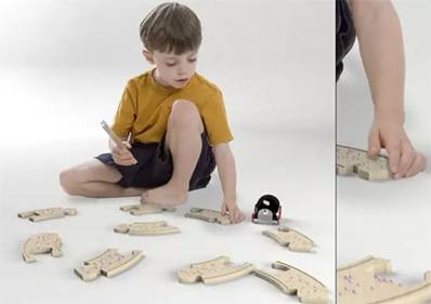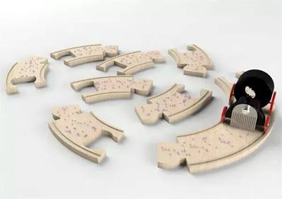 这个玩具其实采用了八音盒的发声原理,把原来放在盒子里的音轨,放在了平面上。每个模块的凸点就是一段音乐,通过不同组合,孩子可以自己创作歌曲。