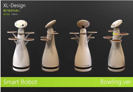 第三种是一种瓦E伊娃化的方案。腹部空间内有滑轮,上扬的手臂处有隐藏式凸棍可将盘子举起。肩膀指示灯会根据状态变色。添加的电子屏可以做出类似小黄人的各种表情。平时在餐厅彼此间也会嘀嘀咕咕低声乱叫增加趣味性。