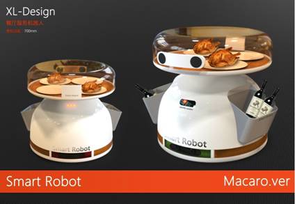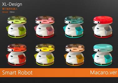 第二种在侧面安装了类似和服袖子的倾斜酒斗,胸前是摄像识别设备能记住顾客,后面是半透式电量指示灯,更适合日式餐厅。灵感来源是马卡龙法式甜饼。因设计要求规定高度700mm没办法只能采用头部当容纳空间。可以自动/手动打开和关闭,把手做成了眼睛状。