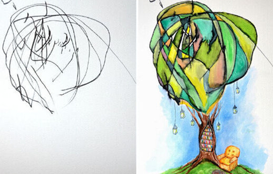 Ruth的艺术敏感让她将女儿Eve随机画的线条变成了人们能辨认的形状。涂鸦上随机的曲线能够成为一只大象的耳朵,弯曲的线条能够成为树枝屈曲盘旋的枝丫。Ruth似乎能看到所有的东西——她能看到一个女人的脸部轮廓或者是一只鸟的鹰钩鼻,而大多数人只能看到一团乱麻。