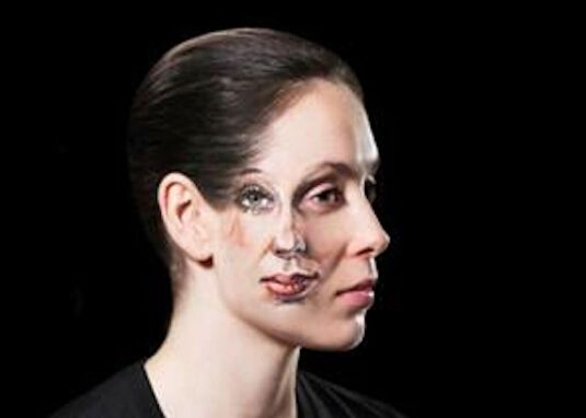 据悉,Hikaru Cho运用丙烯酸颜料在模特身上作画,受现代科技启发共创作出6张科幻人脸设计。主题为 “无线充电”的作品中,模特的脖子部分几乎完全隐形,而上方的头颅仿佛漂浮在空中一般。而在另一张名为“滑动屏幕”的作品中,模特一侧的脸颊被做出奇妙的动态感。