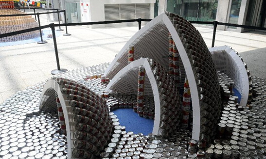 4月27日,香港食物回收机构“惜食堂”在香港中环元创方举办“爱心罐香港2015”活动,利用50000个易拉罐堆砌以世界名胜为题的巨型创意作品,希望引起人们对基层人士饥饿问题的关注。