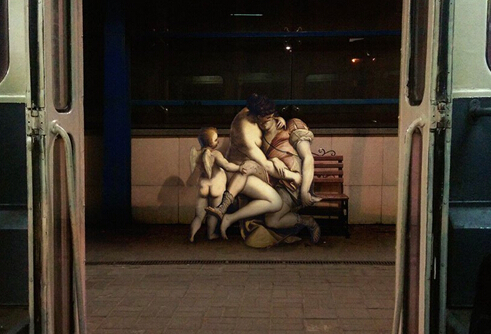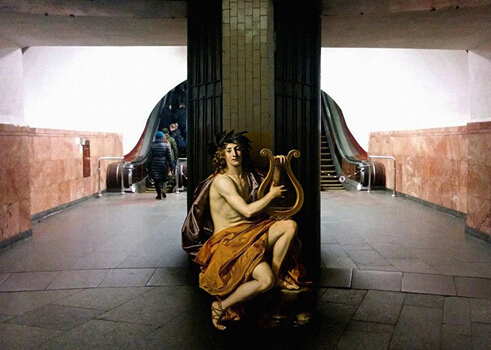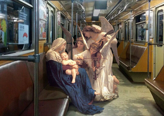 假如上帝和天使生活在现代,他们的生活将是怎么样的?会不会像普通人那样进酒吧,坐地铁……乌克兰艺术家Alexey Kondakov就这个问题进行了创作,让古典油画中的角色穿越到现代场景当中,形成了一组有趣的“穿越到现代的经典”。上图中,艺术家把威廉·阿道夫·布格罗的《Song of the Angels Christmas Cards》中的场景从幽静的羊肠小道转换到了地铁中,却毫无违和感。