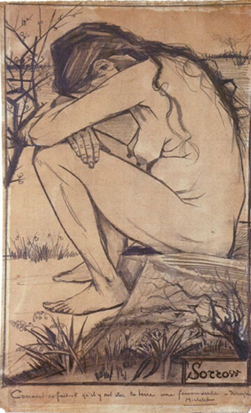 在海牙,梵高遇上了风尘女子西恩,出于某种同情或怜惜,他和这个已经有一个5岁孩子的苦命的女人同居了。西恩给了梵高家庭的温暖,也给了他创作的灵感,梵高以她为模特画了这幅画,“在那位苍白、瘦弱的女人身上,在那些疙疙疤疤的黑色树根身上,我想表现为生活而进行的斗争。”在1882年7月2日,西恩生下了威廉,那并不是梵高的孩子。