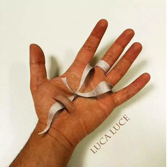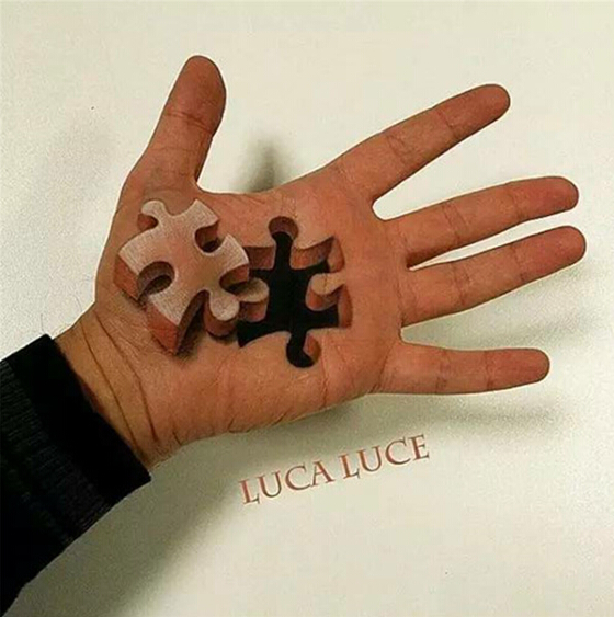 Luca擅长处理阴影和绘制具有真实感的图画。他将这两者结合在一起,运用到了他那独特手掌画系列中的每幅图片中,最终被创造出来的成品真实得令你不敢触摸。比如,他在他的手掌上花了一个从他手掌上拿下的拼图,被拿走的部分留下了一个深不见底的坑。整幅图片如此真实,看上去就像他的手掌被拿掉了一部分,只剩下他手上的这些组织。