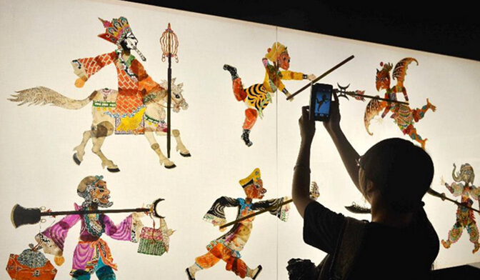 1)9月20日,参观者在中国美院民艺博物馆拍摄《西游记》相关皮影作品。
