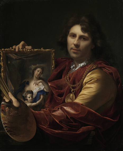 也有画家“自拍”晒幸福。阿德里安·凡·德·韦夫画的是他本人拿着他自己画的妻子女儿的“合影”。据说这位画家钟爱这幅合家欢,一直拒绝出售。