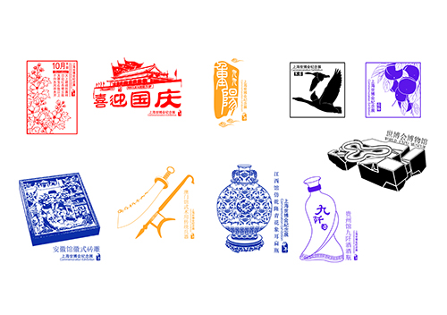 除了世博会博物馆章、国庆节章和重阳节章外,10月份新推的印章还有世博会纪念展展品章、节气章和月章。2枚节气章为寒露章和霜降章。4枚展品章分别是:贵州馆九阡酒酒瓶章、江西馆仿乾隆青花象耳扁瓶章、澳门武术用传统兵器章和安徽馆徽式砖雕章。
