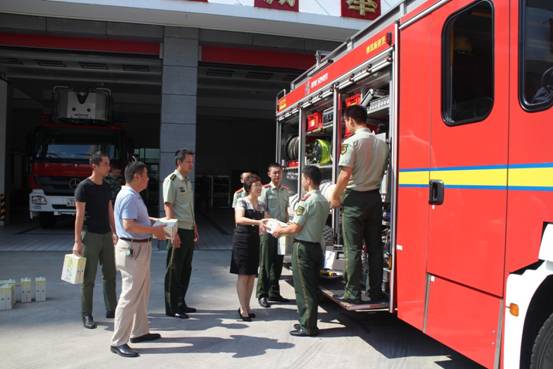 “八一”建军节前夕,为感谢党建联建单位黄浦区卢湾消防中队消防官兵一年来对世博会博物馆消防安全工作的指导帮助,7月29日下午,世博会博物馆党总支书记蒋莎一行冒着38度高温,带着世博馆的拥军情谊,来到消防中队驻地慰问了奋战在酷暑下的消防官兵们。 黄浦区卢湾消防中队的官兵们感谢世博馆领导对他们的关心,表示将通过党建联建平台,更好地做好党建联建、军民共建工作,推进区域消防工作和世博馆新馆建设。 当日,蒋莎书记还代表世博馆对本馆的两名退役军人进行慰问。