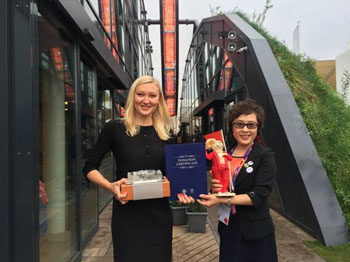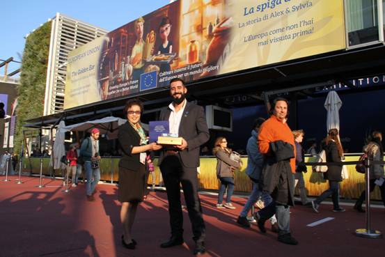 米兰时间2015年10月31日,米兰世博会欧盟馆向世博会博物馆捐赠展品,欧盟馆事务经理Marco Ricorda、米兰世博会博物馆展馆馆长蒋莎出席捐赠仪式。