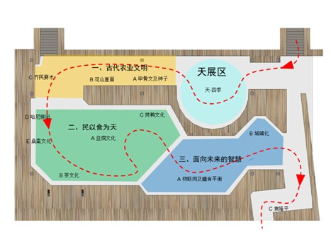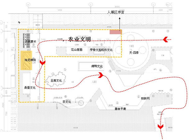 意大利米兰世博会4950平方米的中国馆馆内展示区域主要包括序厅及“天”、“地”、“人”、“和”四个展厅。其中,“人”展区是中国馆具体展项的集中展区,围绕农耕文明、民以食为天、未来的智慧三大板块进行展示,云南的哈尼梯田展项为人展区中农业文明部分的第四个展项,与齐民要术展项和桑蚕文化展项相邻。