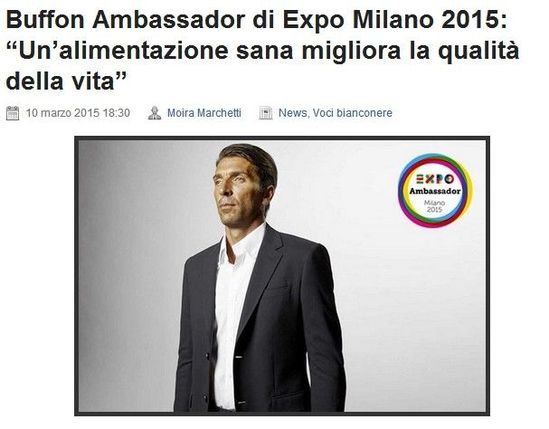 意大利是一个足球盛行的国家,为了能让这届世博会得到更多的关注,世博会的组织者最终选择尤文队长布冯成为本届世博会的形象大使。意大利著名评论员朱塞佩-萨拉对于布冯的当选十分兴奋:“布冯能够当选本届大会的形象大使,我非常的高兴。布冯的言传身教会让众多的年轻人与体育的爱好者更加关注世博会的主题。”
