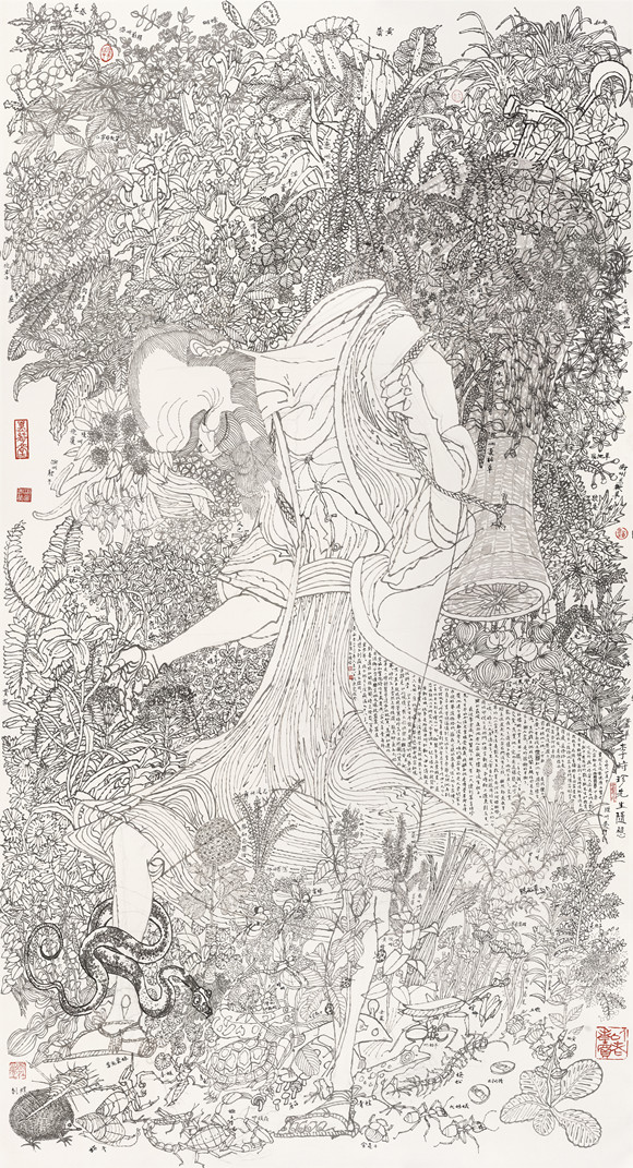 最近常害病,和西医做了朋友。有一天,读到篇李时珍先生生平的介绍文章很受教益。我虽知他是博学者,却不清楚他连个举人都没考上,咱们国家有的是大学问家不乖从科举这条路的。爷爷、父亲的教导,狠狠地在家读了好几年书,学问满溢到京城去了,皇帝爷也把他弄到宫里做事,听说他有幸看到弘治孝忠[宗]皇帝叫四十九个人一年功(工)夫不到手绘的一部《御制本草品汇精要》,这恐怕对他以后研究出《本草纲目》起了很大的启发和推动作用。故事是那样曲折和动人,由不得鼓足勇气去买了一部来,没想到它竟然好几十斤,三十六大册,原版原样,不能不感谢老祖宗和现代科学。皇皇五百年前巨著罗列眼前,梦想亦难见如此规模,几天因快乐而难得安枕。某日某日起,提纸提笔写《时珍先生出巡图》以贺此举。时珍先生当然未拜候过,取其神气而已,也算是一种对医学进步的祝贺。高兴知道北京协和医院将作百岁庆典,家父年青每外出返乡必宣讲京城及沪杭盛景,某届则喜道协和开张热闹。时光倏忽,百年重步耳。我个把月之后岁满九十八了。真想不到岁月真不经用。