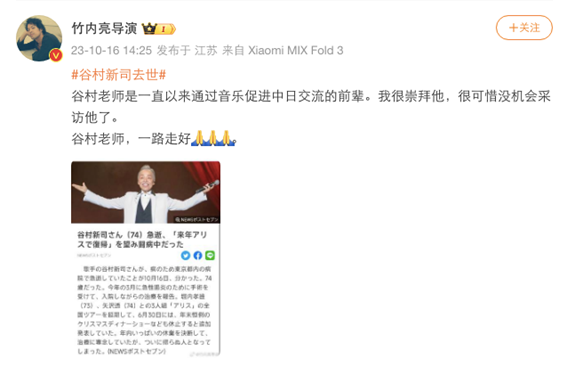 随后,日本导演竹内亮也发文悼念:谷村老师是一直以来通过音乐促进中日交流的前辈。我很崇拜他,很可惜没机会采访他了。
