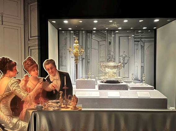 每一道菜是按顺序逐道享用,人们不会把所有菜肴都放在餐桌上,因此长桌中间就需要放置装饰品。餐桌上的精美装饰物也象征主人的财富和声望,并展示主人家能够为宾客提供高品味的用餐环境。