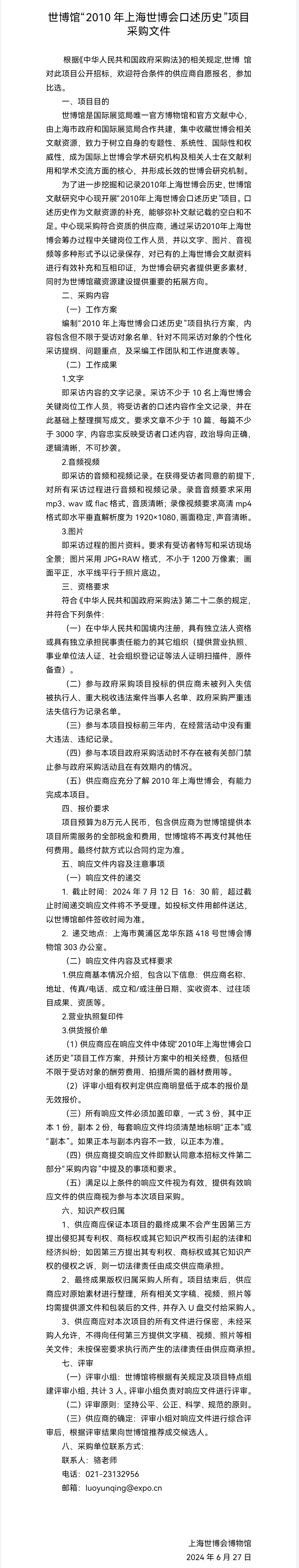 世博馆“2010年上海世博会口述历史”项目采购文件