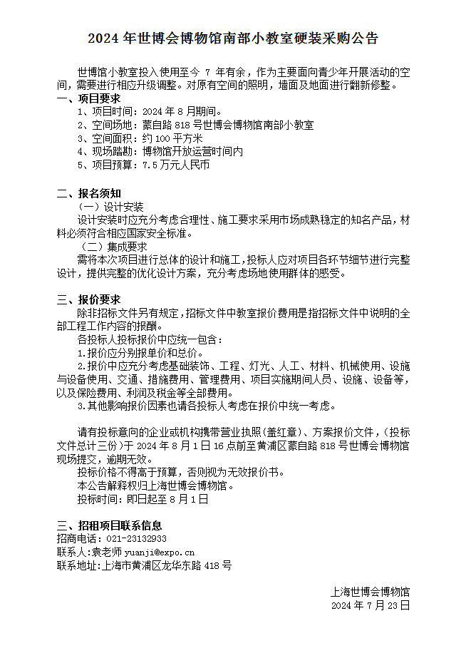 2024年世博会博物馆南部小教室硬装采购公告