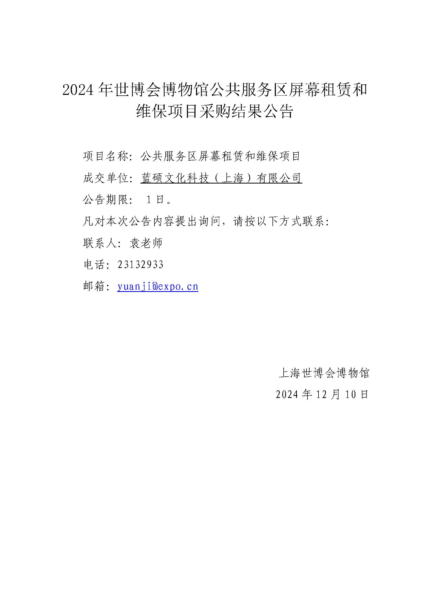 2024年世博会博物馆公共服务区屏幕租赁和维保项目采购结果公告