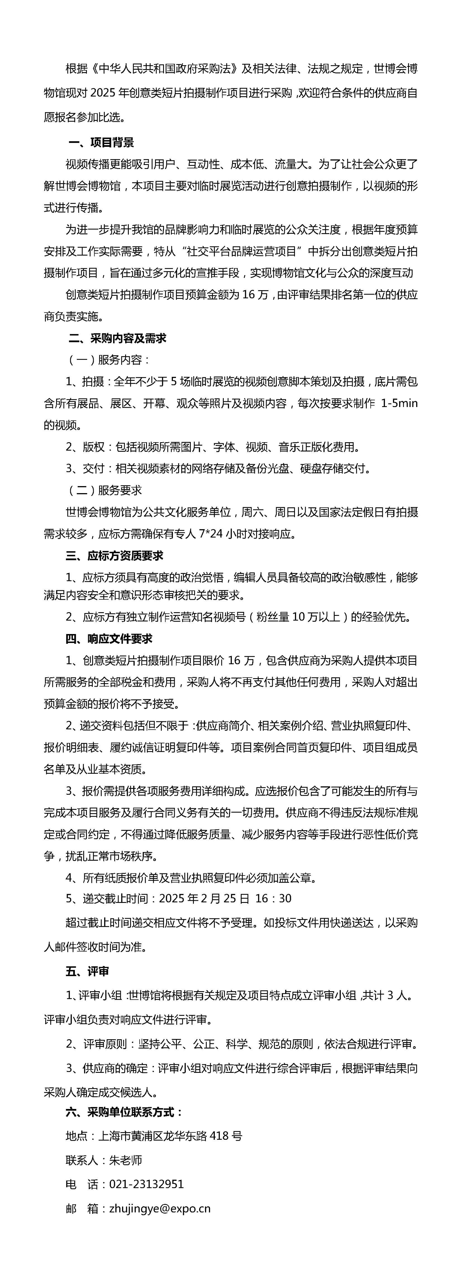 世博会博物馆创意类短片拍摄制作项目采购公告