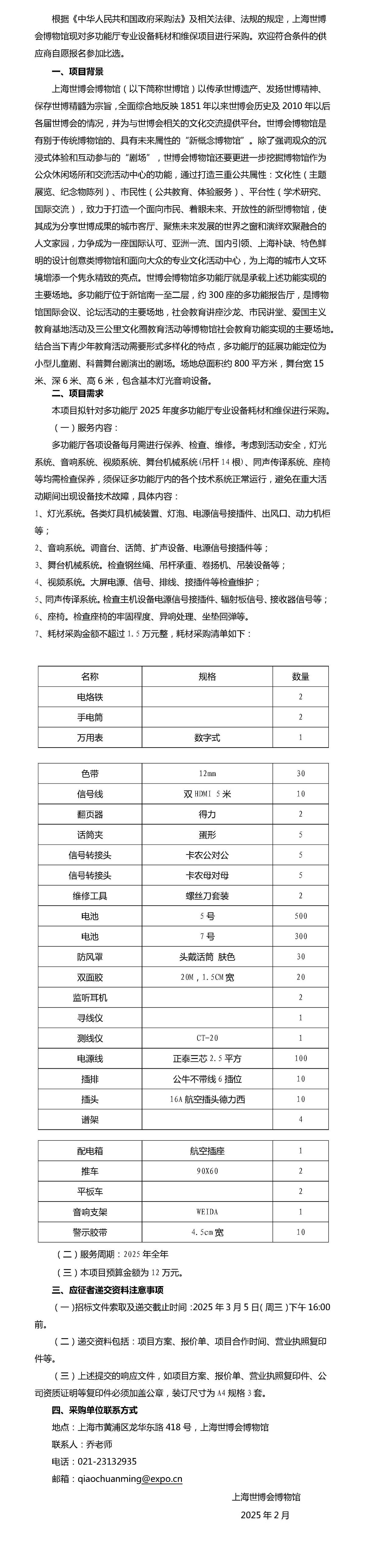 世博馆2025多功能厅专业设备耗材和维保招标公告